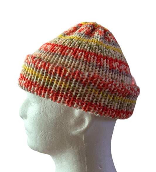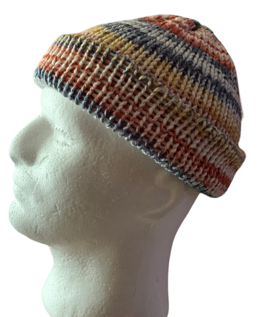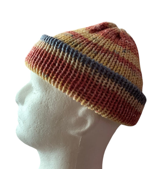 Starburst tangerine,denim blue, pale yellow,dull red, Skull Cap, Beanie, Dockers Hat, Fishermen Cap, Skully (KNITTED)